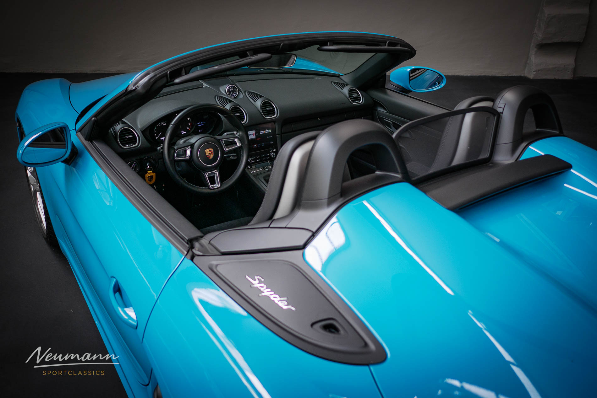 Der Porsche 718 Spyder war der Lichtblick für die traditionellen Porsche Fans, nachdem Porsche beim Modell 718 erstmalig auf einen Vierzylinder turbo in einer Boxster Modellreihe setzte. Er führte die Tradition eines großen Saugmotors fort. 4,0l, 420 PS, in diesem Fall mit einem 6 Gang Handschaltgetriebe kombiniert, führen zu einer Höchstgeschwindigkeit von 300 km/h. Dieses Exemplar ist im Farbton miamiblue lackiert, kombiniert mit einer klassischen Innenausstattung in schwarz. Handgeschaltet, offen, direkt und schnell, erfüllt er alle Kriterien eines echten Porsche. Wir bezeichnen es als Genussmittel für den Porsche Sportfahrer.