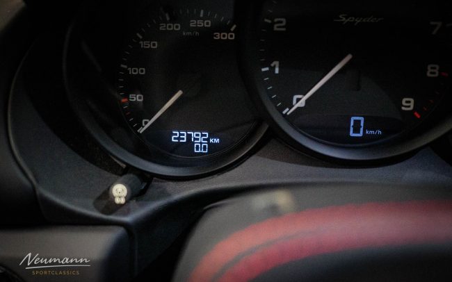 375 PS bei 6.700 Umdrehungen hat der vier Liter große Boxer-Motor, natürlich noch ein klassischer Saugmotor. Er klingt beeindruckend, mit der hier verbauten Akrapovic Anlage sogar Gänsehaut erzeugend, ein extremer Gegensatz zu einem modernen leisen E Fahrzeug, aber wohltuend für den Sportwagenfan, der ohne Radio seine Zeit auf der Landstraße geniesst. In nur 4,5 Sekunden auf 100 km/h, 290 km/h Höchstgeschwindigkeit. Optisch ein Fahrzeug, das durch seine GT-Silber Sonderlackierung ab Werk und dem, für den Spyder kennzeichnenden Softtop-Verdeck, einen hohen Wiedererkennungswert hat. Für viele einer der besten Porsche überhaupt.